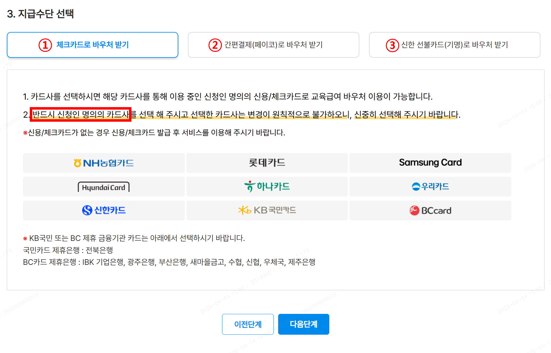 1. KB국민, BC카드 제휴가 되어있지 않은 금융기관의 카드는 지급 불가