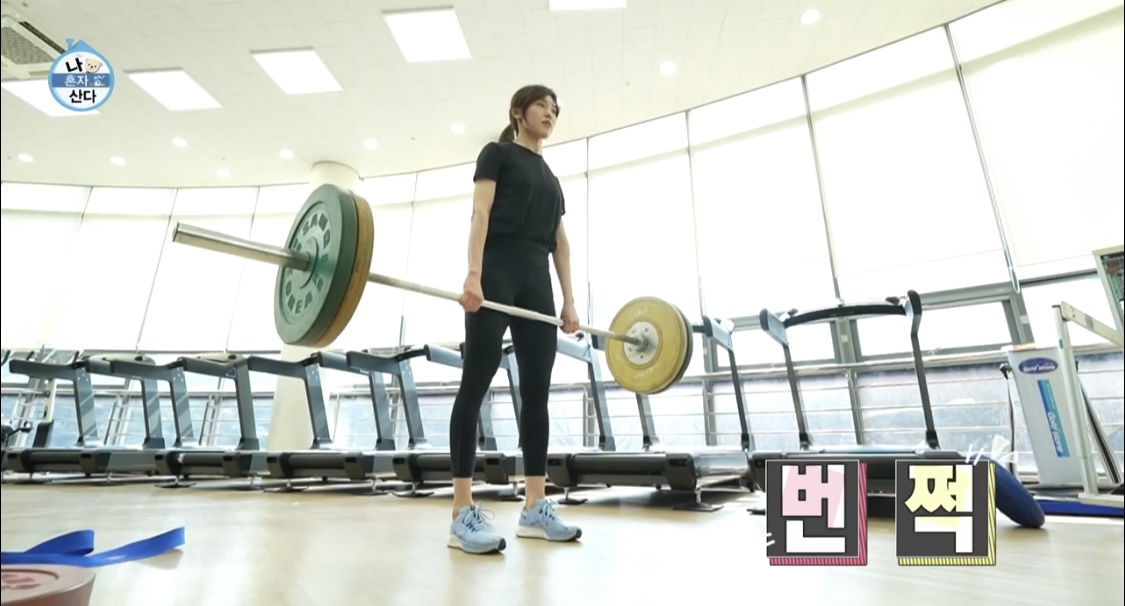 이어서 보기만해도 무거워보이는 무게를 들고 데드리프트를 하는 김아랑 선수. 이날 방송에서는 80KG정도의 무게를 들었는데 한창 웨이트에 집중할 시기에는 125KG까지 들었다고한다. 본인보다 몇배나 무거운 무게를 거뜬히 들어낸다.