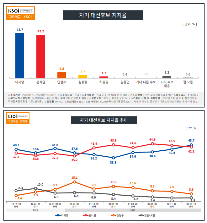 한국사회여론연구소에 따르면 이번 여론조사의 결과는 이재명 후보 43.7%, 윤석열 후보 42.2%로 1.5%의 오차범위내 접전을 벌이고 있다는 것이다. 지난주 이재명 후보의 여론조사 지지율은 40.4%, 윤석열 후보의 지지율은 43.5%였으며두 후보의 오차범위 격차는 3.1%의 차이였다. 오늘 기준으로 두 후보의 지지율의 격차는 1.5%이지만 두 후보간의 순위에 변동이 생겼다는 점이 눈여겨 볼 만하다.