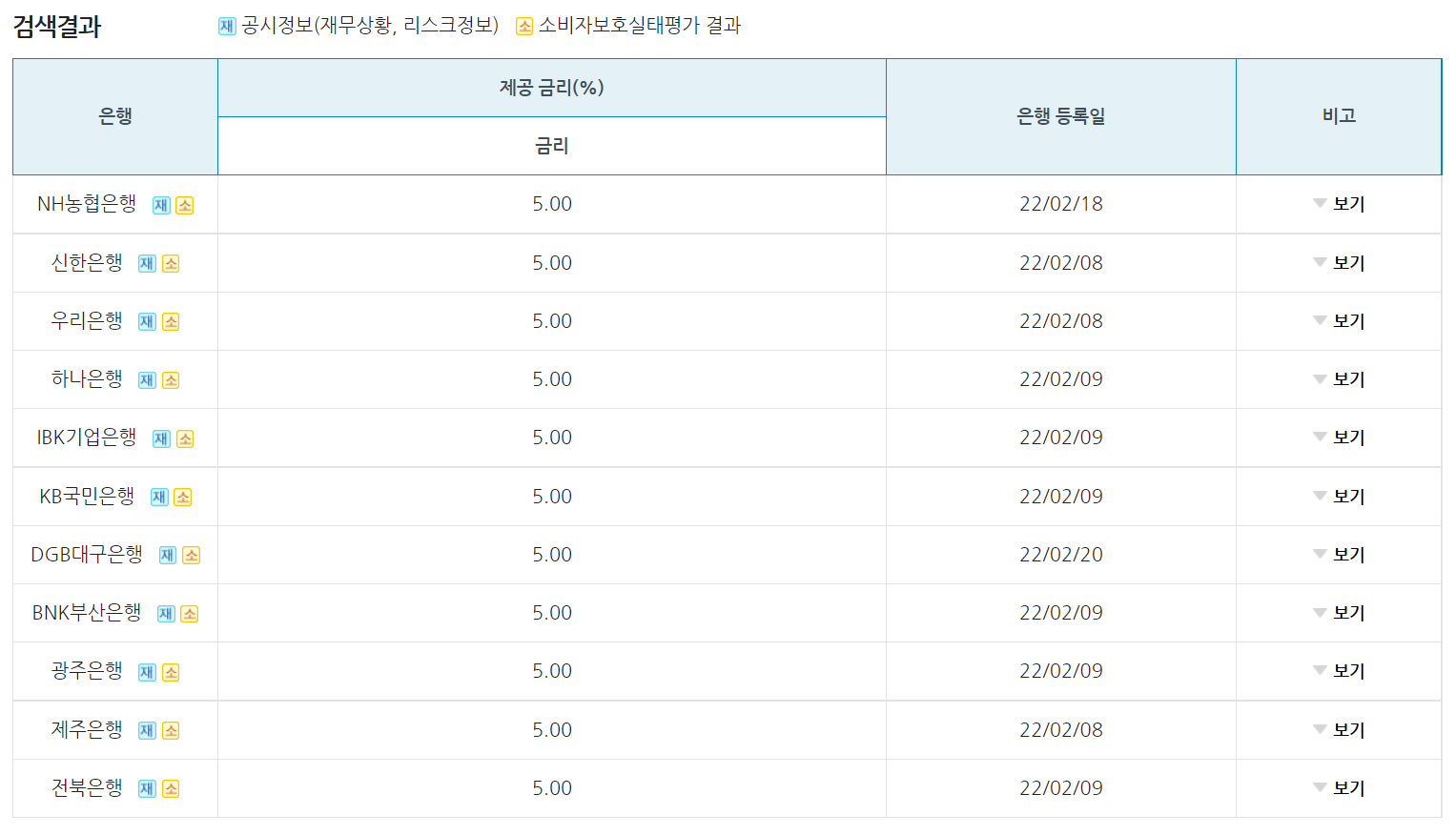 청년희망적금을 취급하는 11개의 은행의 기본 제공 금리는 위와 같이 5%로 동일하다.